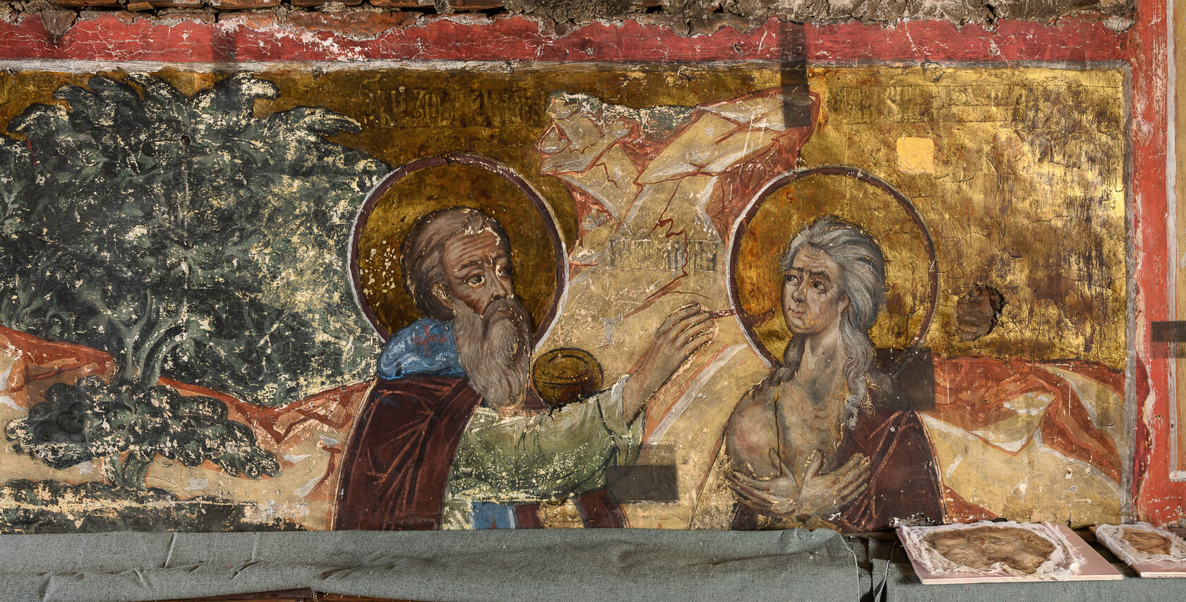 На алтарной стене был обнаружен еще один редкий для древнерусских стенописей цикл, но он принадлежит основному слою росписи 1643 года. Цикл посвящен преподобной Марии Египетской и состоит из двух сцен: «Старец Зосима встречает преподобную Марию в пустыне» и «Причащение Марии Египетской». Уникальность цикла в том, что он был задуман и исполнен полуфигурным. Такая особенность скорее всего была определена вытянутым и невысоким участком стены, который возвышался над древним иконостасом, в то время уже дополненным иконами праотцев. Этот иконостас в 1653 году был заменен более высоким, который дошел до нашего времени.